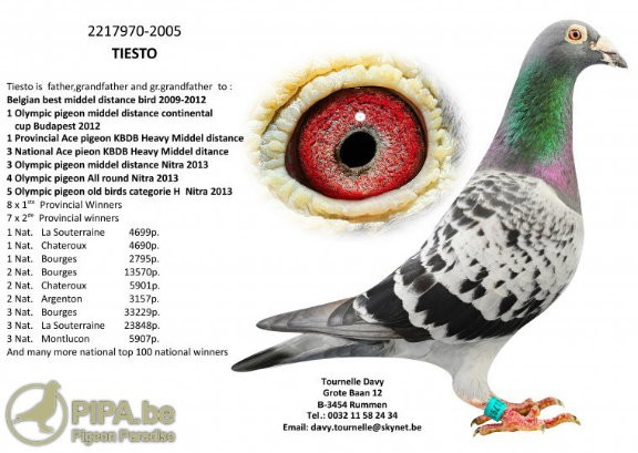 比利時呂門(Rummen)的戴維.吐尼爾(Davy Tournelle)的超級種鴿"鐵斯托"(Tiesto)不斷證明自己的育種價值,世界著名DJ 鐵斯托(Tiesto)最擅長啟動一場聚會的氣氛,而以他的名字命名的種鴿"鐵斯托"則知道如何作育頂級鴿後代:他的後代為吐尼爾贏得了眾多頂級名次和最佳頭銜。