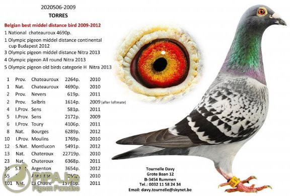 查看"托雷斯"的子代和孫代的成績單。要知道"托雷斯"從2013年才開始來到種鴿舍參加育種。"托雷斯"的母親"芙蓉"(Fleur BE07-2192194)為波治全國11.933羽冠軍全姐妹,落後同鴿舍賽鴿取得20.954羽亞軍。她擁有傑夫、盧克和納迪亞.胡本家族的血統。查看"托雷斯"的完整血統書。"托雷斯"是鐵斯托王朝的代表鴿之一,但是他的兄弟和姐妹也都非常成功。