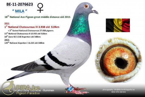 "米拉"的母親 "灰國家雌"(Blauw Nationaaltje BE07-2192078)出自波治全國11.933羽冠軍,"灰國家雌"的父親擁有戈馬力.佛布魯根的"軍校生"(De Kadet)和"鴿王號"(De As)血統。這些血系在他們誕生30年後繼續在比利時賽鴿運動中發揮著重要作用。查看"米拉"的完整血統書。
