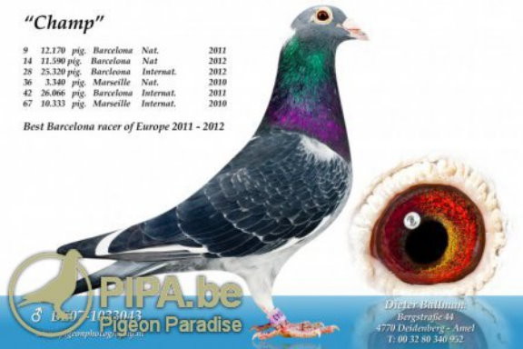 對於迪特.巴爾曼來說:他的賽將必須有絕佳的定位能力;必須有能長時間飛行的絕佳的毅力;而最為重要的是,這些鴿子必須是兼具速度和耐力。而"冠軍號"堪稱迪特鴿的完美案例。在巴賽隆納的最近兩場賽事中,他的速度相當快,這種快速度一直延續在整個比賽的全過程。在2011年,"冠軍號"以分速1,328米/分鐘位列巴賽隆納國家賽指定鴿中9位。在荷蘭,由於適宜的情況,有很多的鴿子已經習慣於在夜間飛行。當然,2011年的情況比較特殊,令人難忘。2011的巴賽隆納賽事也許近年來歷史上最為艱苦的賽事之一了,因為鴿子們普遍的分速都是下降許多。而對此,我們只能這樣調侃了:賽鴿有兩類,一類是巴賽隆納專家鴿,一類是非巴賽隆納專家鴿。而"冠軍號"毋庸置疑是前一種。在2012年,他再次以分速1,437米/分鐘在國際賽中早早歸巢,獲得勝利。他是如何在西班牙當地時間14:00被放飛的一大批賽鴿中脫穎而出的?我們的推論是? "冠軍號"(他在第二天清晨8:13打的鴿鐘)在從巴賽隆納到阿美爾的賽程中晚間飛行了數個小時,他的整個飛行時間為18小時13分,總賽程長達1,039km。在第一天的飛行中,他夜間飛行至22:57,清晨5:08又開始飛行,這就是他高速度的秘密。"冠軍號"確實是名符其實,但他的鴿主也許把他命名為"夜行者"更為貼切呢!