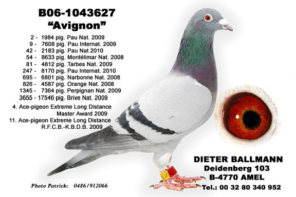 另一個例子是:"亞特南"(D'Artagnan)。這羽鴿子贏得了2005年波品納國家賽7,611羽中4位(分速 963米/分鐘)。他在884公里的賽程中在當天晚上22:17凱旋歸來,成為略低於900公里賽程中唯一當日歸的賽鴿。而另一例子是能夠代表這個鴿舍的水準的是著名的"亞維儂"( Avignon)。