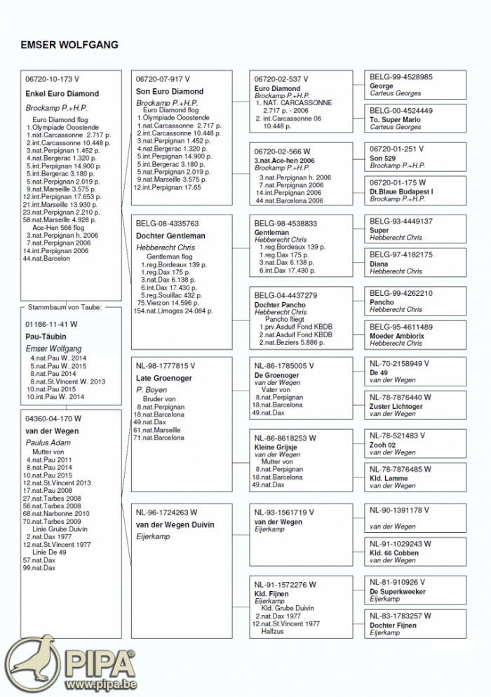 獲得波城國際賽德國全國1.175羽冠軍為恩麥斯.沃夫崗(Emser Wolfgang)鴿舍,該舍冠軍鴿DV01186-11-41灰母,是在比利時時間星期日晚上21時32分47秒歸巢,翔距893.409 公里,創下平均分速1126.93米/分。