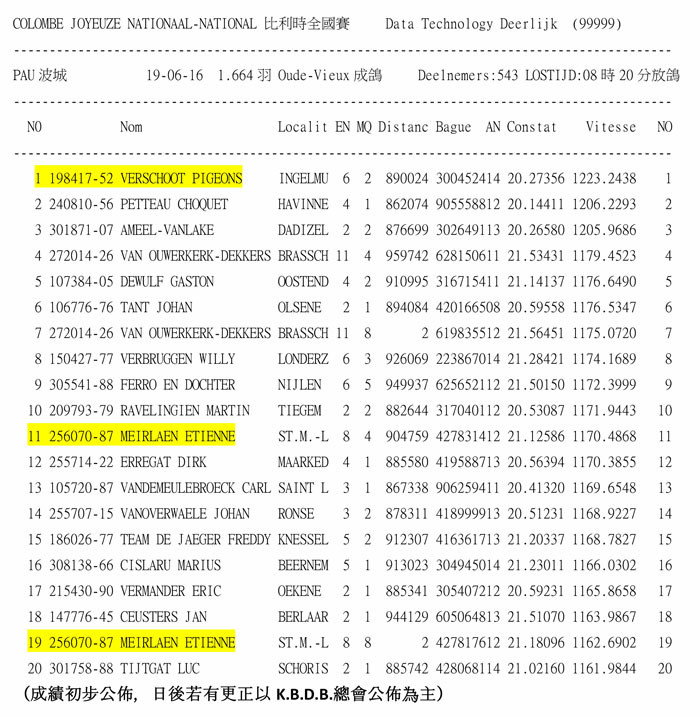 2016年波城比利時成鴿組全國1.664羽冠軍