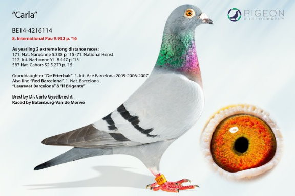 波城全省冠軍及國際9,932羽8位入賞鴿是 BE14-4216114 "卡拉"(Carla)。她曾在一歲鴿時獲得2次入賞,其中有拿邦全國5,338 羽172位。 "卡拉"是由克涅瑟拉爾(Knesselare)的 卡羅.吉塞布賴特醫師(Carlo Gyselbrech)作出,這次獲得的佳績,正是巴藤伯格和吉塞布賴特聯合育種的成功結晶。她的父親是"伊特貝"(Etterbak)的一羽直子 ("伊特貝"曾為弗羅斯.梅爾斯(Vrosch-Meijers)獲得2005-2007 年巴賽隆納鴿王冠軍)。 她的母親是吉塞布賴特家族聲名卓著的"巴賽隆納榮耀號"( Laureaat Barcelona)的回血鴿。"卡拉"的同孵是波城賽中巴藤伯格的第4羽歸巢鴿. 點擊此處,查看"卡拉"的血統書.