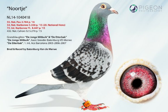 "小諾特"(Noortje)NL14-1040418 曾在3場比賽中入賞前100位。 她曾在一歲鴿時獲得拿邦全國5,338羽54位 (國際一歲鴿組 8,447羽72位) 和卡奧爾全國5,279 羽 432位。"小諾特"是"莉貝拉"( Libelle)的半姐妹, "莉貝拉"獲得巴賽隆納全國 6,903 羽21位。"小諾特"的父親是頂尖種公"年輕白腹號"(Jonge Witbuik)的回血直子,她的母親是前文提及的"伊特貝"的一羽直女。點擊此處,查看"小諾特"的血統書.
