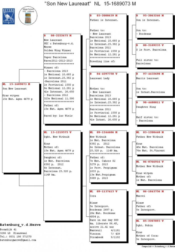 巴賽隆納全國49位入賞鴿"新白腹號直女"的父親 "新白腹號"是超級賽將,榮獲巴賽隆納全國冠軍&國際6位,"新白腹號"亦是超級種公。"新白腹號直女"的母親出自"塔碧斯號"(塔碧斯全國10,853羽冠軍) x"隆河女郎"( Rhone Lady,馬賽聯省冠軍). 點擊此處,查看其完整血統書 . 巴騰伯格的同僚及朋友AD.範潭(Ad Fortuin)在巴賽隆納中獲得全國8位入賞,其入賞鴿是羽超級雌,她去年曾獲得聖維仙全國5位。其父親是巴藤伯格-范德米衛原舍鴿, 是"白腹號"的超強回血鴿。而這只是雨果.巴藤伯格品系鴿子在其他鴿舍獲得成功的令人印象深刻的例子之一。其他的例子還有:波爾多全國冠軍(派帕斯組合, De Pijper combination) 和阿讓國際31位(魯茲父子, Rutz & Sons)。這些佳績都再次證明,巴藤伯格品系鴿是頂尖品質的鴿系,其在國際經典賽中屢屢大展神威。
