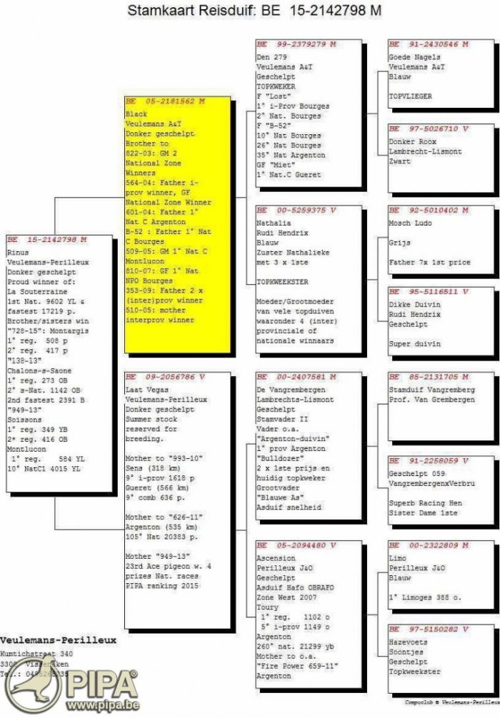 獲得比利時拉斯特年I (La Souterraine I )全國一歲鴿組9.602羽冠軍及19位為佛勒利曼-派利勒斯(Veulemans-Perilleux)鴿舍,該舍冠軍鴿是在比利時時間7月3日(星期日)下午13時15分19秒歸巢,翔距570.329公里,創下平均分速1480.16 米/分,同時也是此回比利時拉斯特年I (La Souterraine I )全國賽交鴿總數17.219羽總冠軍鴿。