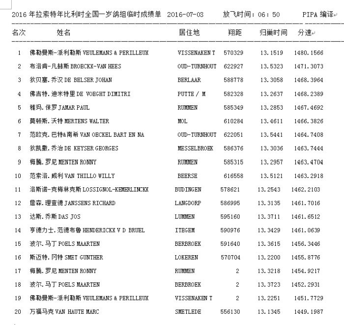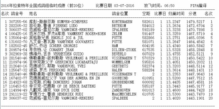 2016年比利時拉斯特年I (La Souterraine I 約550公里)國家賽,6月30日集鴿總數17.219羽(含一歲鴿組9.602羽、成鴿組7.617羽),比2015年集鴿10.245羽多了6.974羽,預定於7月2日(星期六)上午要放鴿,因天氣不佳延遲到7月3日(星期日)早上6點50分放鴿。