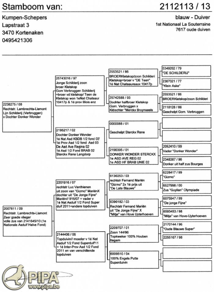 獲得比利時拉斯特年I (La Souterraine I )成鴿組7.617羽全國冠軍為庫彭.斯赫芬斯(Kumpen-Schepers)鴿舍,該舍冠軍鴿B13-2112113灰公是在比利時時間7月3日(星期日)下午13時23分47秒歸巢,翔距582.611公里,創下平均分速1479.52 米/分。