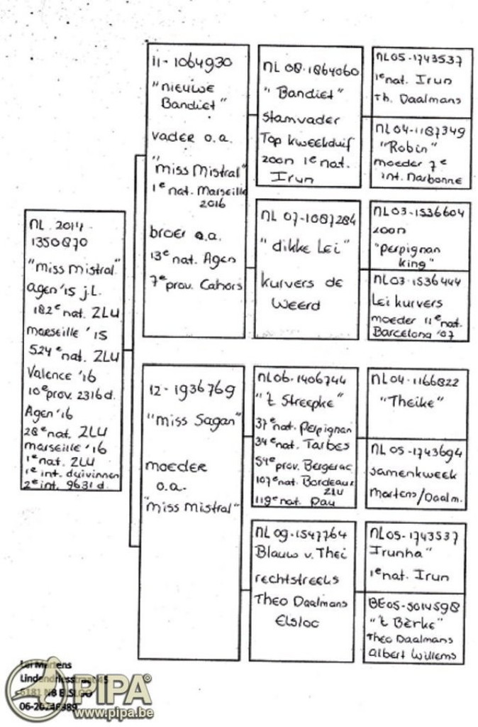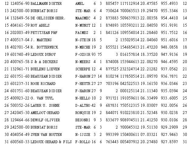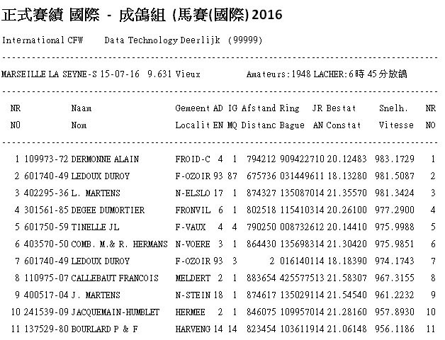 獲得馬賽國際賽荷蘭全國3.320羽冠軍為馬騰斯.雷(Martens Lei)鴿舍,該舍冠軍鴿是在比利時時間
