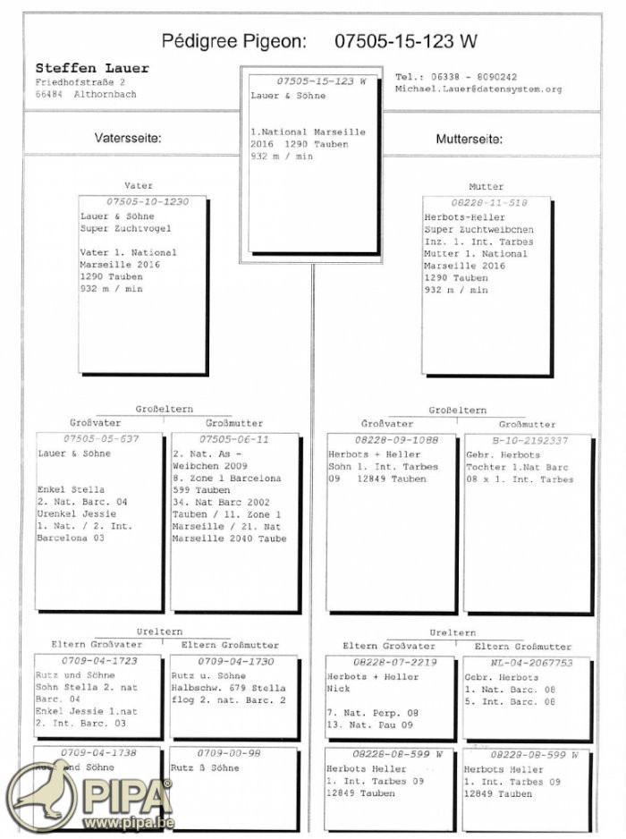 獲得馬賽國際賽德國1.290羽全國冠軍為勞爾(LAUER U. SOHNE)父子鴿舍,該舍冠軍鴿DV07505-15-123灰母於比利時時間7月15日(星期五)當日晚上19時03分0秒返舍,空中距離687.831公里,創下平均分速932. 019米/分。