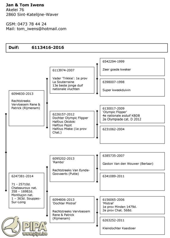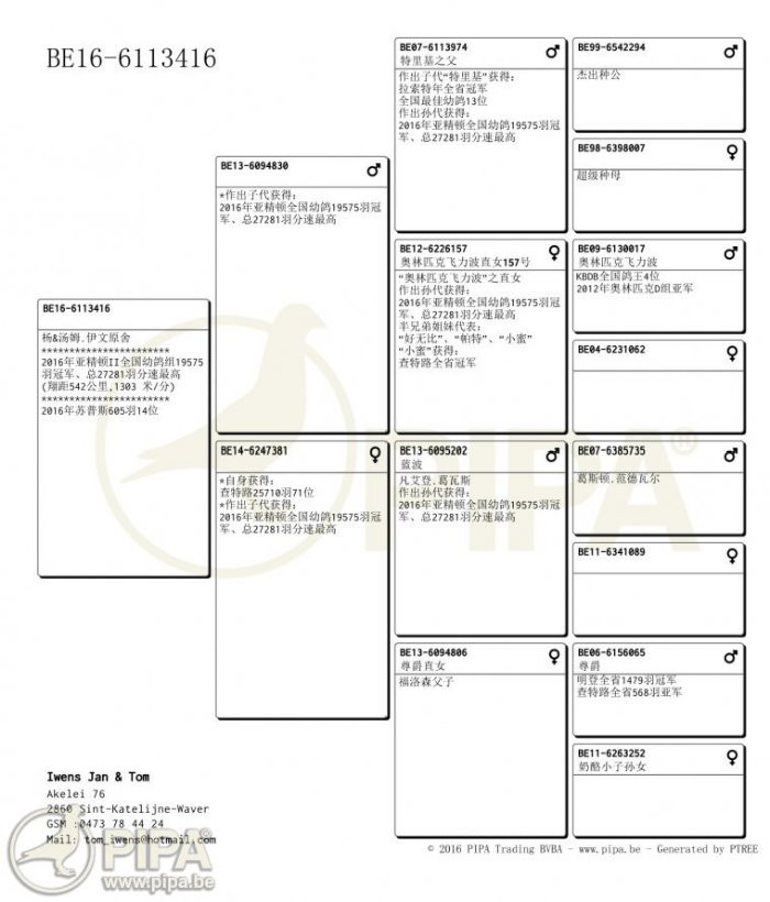 獲得亞精頓II (Argenton II)國家賽比利時全國"幼鴿組19.575羽"冠軍為伊文.楊和湯姆(Iwens Jan & Tom)鴿舍,該舍冠軍鴿B16-6113416灰母是在比利時時間8月13日(星期六)下午14時15分57秒歸巢,翔距541.975公里, 創下平均分速1302.98 米/分,此鴿同時也是參賽總數27.281羽的總冠軍鴿。