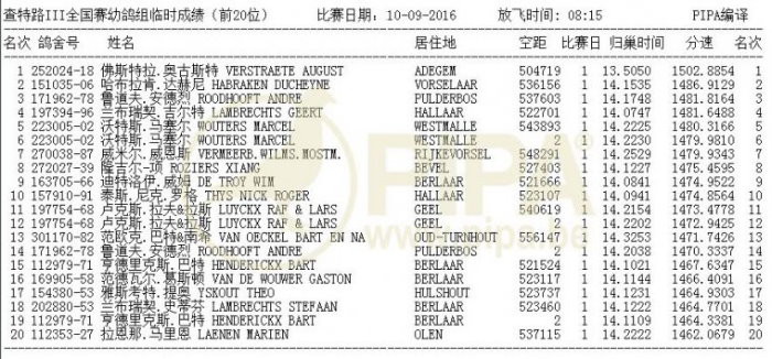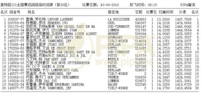 2016年比利時查特路III全國賽成鴿組2.192羽 臨時成績(前20位):