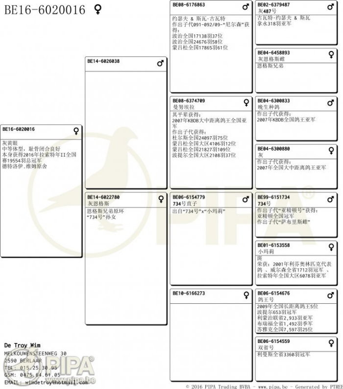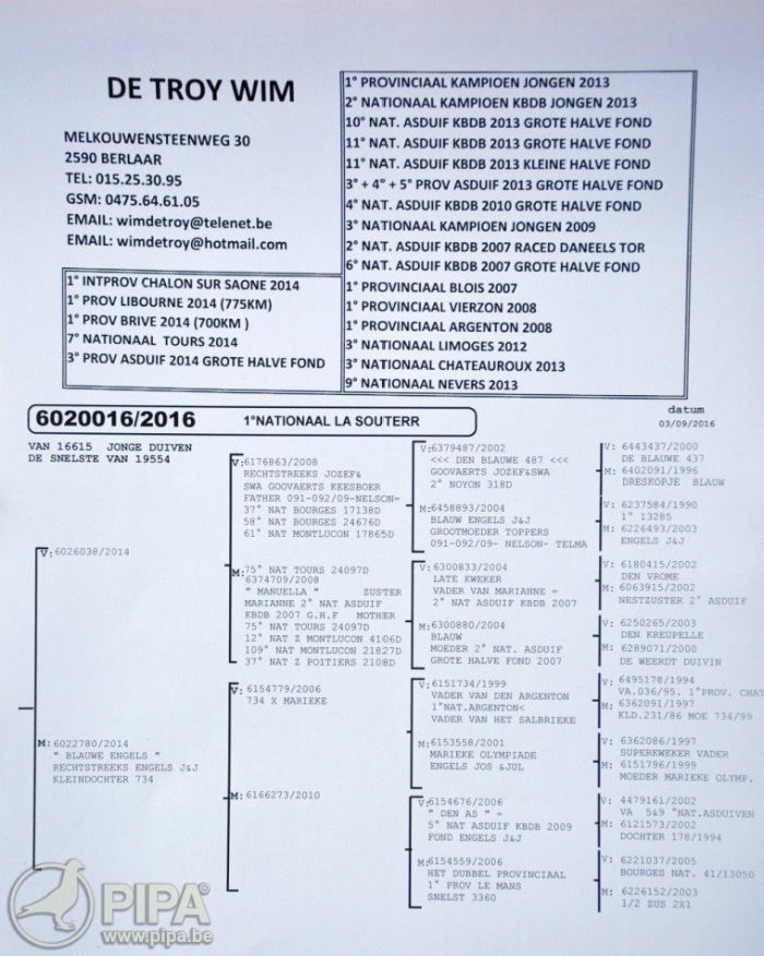 獲得2016年比利時拉索特年II全國"幼鴿組"16.615羽冠軍為威姆.迪特洛伊(De Troy Wim)鴿舍,該舍冠軍鴿B16-6020016灰母是在比利時時間9月3日(星期六)下午15時22分22秒歸巢,翔距589.197公里,創下平均分速1428.82 米/分,同時也是此回拉斯特年II國家賽集鴿總數19.554羽的總冠軍鴿。