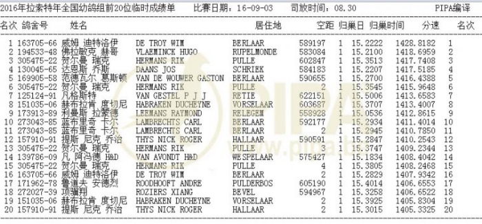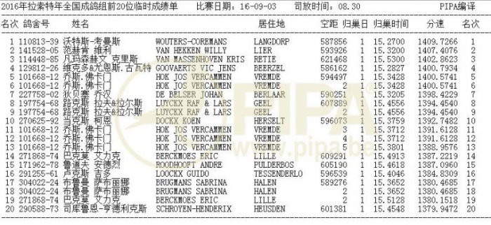 2016年拉索特年II全國賽"幼鴿組"16.615羽臨時成績單(前20位)
