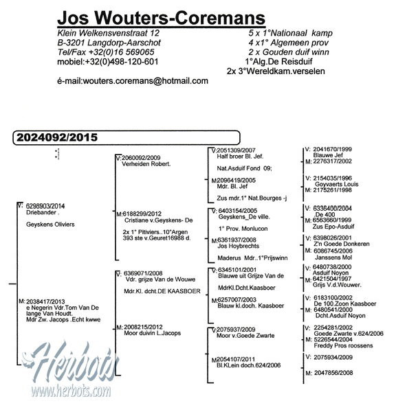 獲得2016年拉索特年II全國賽"成鴿組2.939羽"冠軍為沃特斯.考曼斯(Wouters-Coremans)鴿舍,該舍冠軍鴿B15-2024092灰母是在比利時時間9月3日(星期六)下午15時27分00秒歸巢,翔距587.856公里,創下平均分速1409.73 米/分。