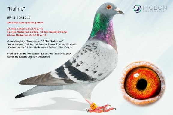 "娜麗安"出自與倚天.梅爾浪聯合育種,父親BE11-4312932為"蒙托邦號"(BE08-4298059 De Montauban)的直子,"蒙托邦號"獲得蒙托邦全國6654羽5位。母親含有雨果的"老白腹號"血統。查看"娜麗安"的血統書。