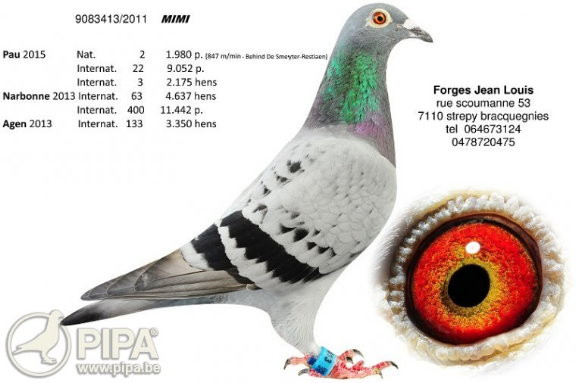 另一羽超級種母"咪咪"B11-9083413班母(Mimi'),這羽雌鴿由 楊-路易士.弗格斯福爾斯福爾斯(Jean-Louis Forges)鴿舍使翔,奧利弗.迪沃夫引進,她僅次於著名的佑斯特.狄斯邁特的"卡斯號"(Cas),獲得2015年波城全國賽9.052羽總亞軍。