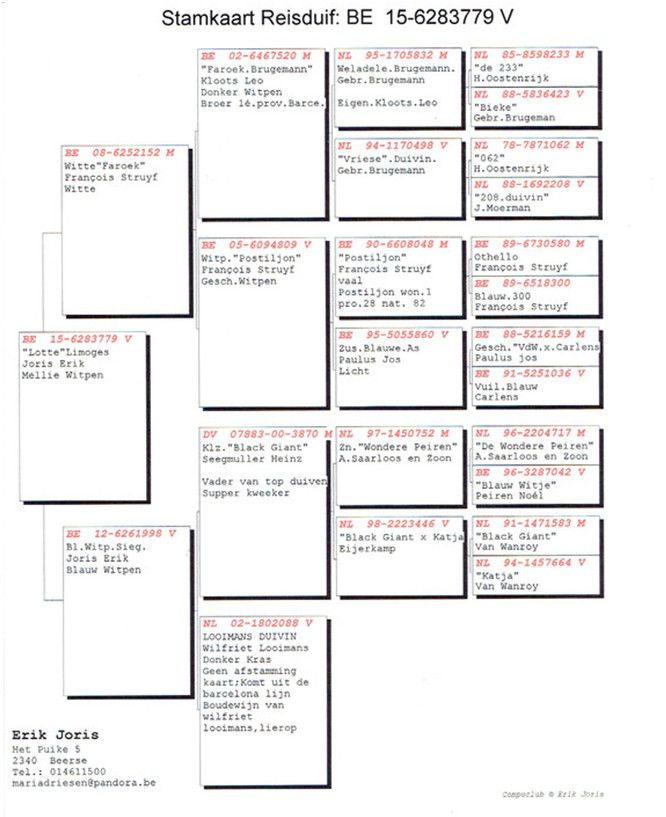 獲得利蒙治國家賽14,924羽冠軍鴿"洛特LOTTE" B15-6283779班白羽.母.血統書