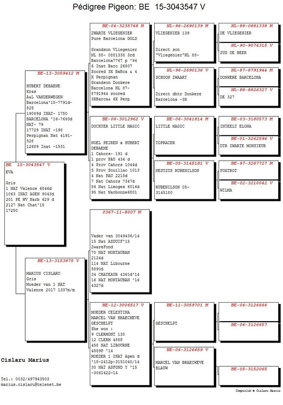 獲得比利時瓦朗斯全國冠軍(成鴿)為西斯拉魯.馬留斯(Cislaru Marius)鴿舍,該舍冠軍鴿B15-3043547花母”伊娃”是在比利時時間當日下午15時12分33秒歸巢,翔距699.094公里,創下平均分速1337.85米/分。