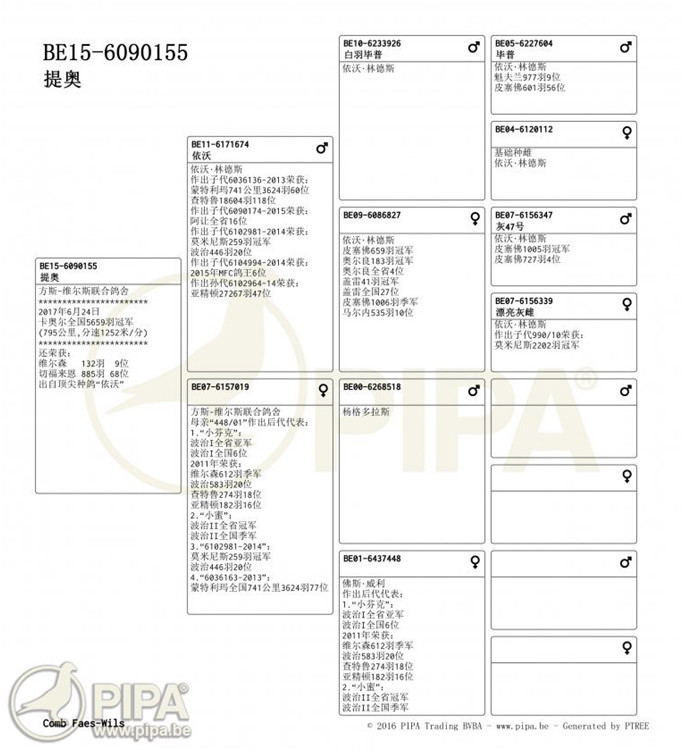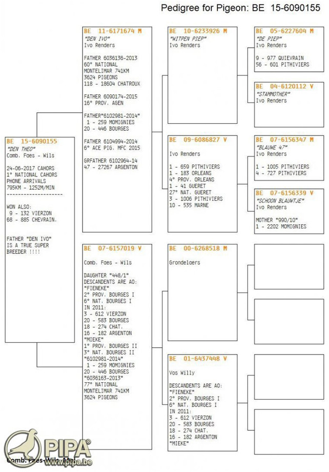 獲得2015年比利時卡奧爾全國(成鴿組5.659羽)冠軍為方斯-維爾斯聯合鴿舍(Comb Faes-Wils),該舍冠軍鴿B15-6090155班白羽公是在比利時時間星期六下午19時10分22秒歸巢,翔距795.557公里,創下平均分速1252.12公尺/分。