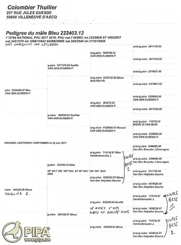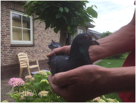 獲得波城國際賽法國全國3.764羽冠軍為帝利耶-塞巴斯蒂安(hullier-Sebastien)鴿舍,該舍冠軍鴿F13-222403灰公,是在比利時時間星期六下午18時04分00秒歸巢,翔距796.27公里,創下平均分速1265.93米/分。