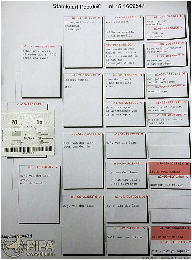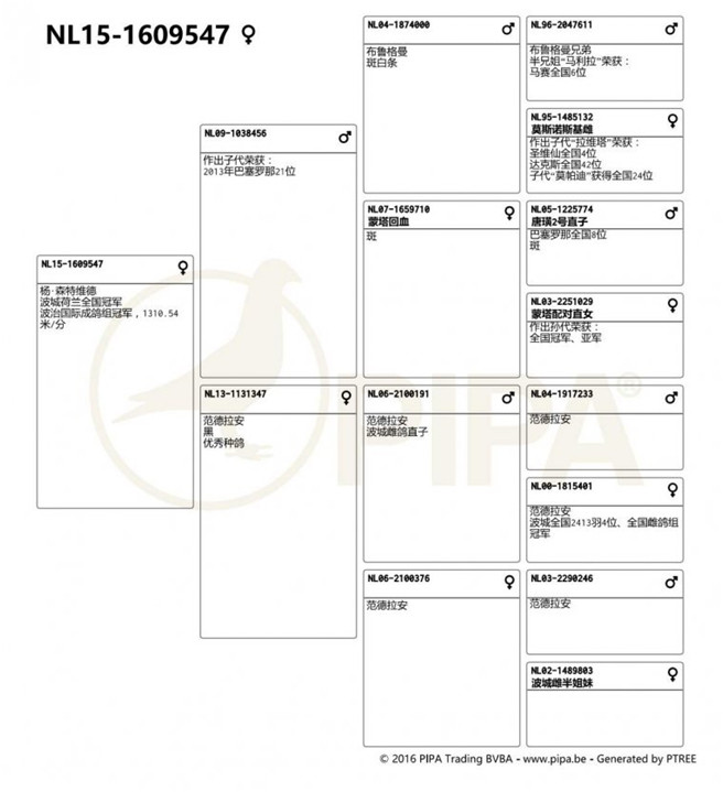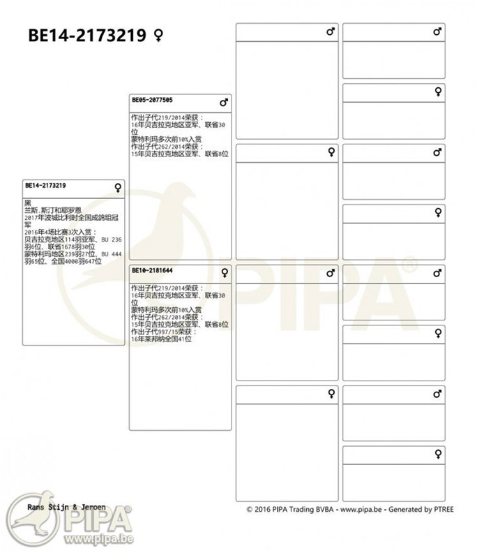 獲得波城國際賽比利時全國2.147羽冠軍為蘭斯.斯汀和耶羅恩(Rans Stijn & Jeroen)鴿舍,該舍冠軍鴿B14-2173219灰母,是在比利時時間星期六下午18時43分02秒歸巢,翔距872.735公里,創下平均分速1306.42 米/分。