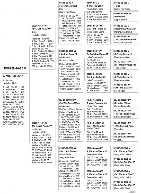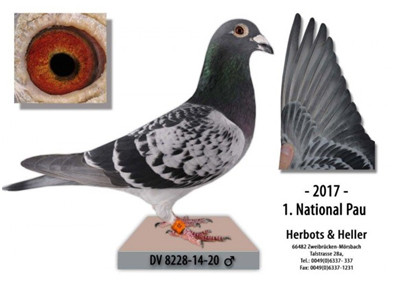 獲得波城國際賽德國全國1.197羽冠軍為賀伯特-海勒(Herbots-Heller)鴿舍,該舍冠軍鴿DV08228-14-20班公是在比利時時間星期六下午18時38分39秒歸巢,翔距850.58公里,創下平均分速1281.67米/分。