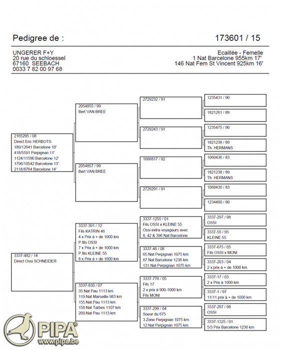 獲得巴塞隆納法國全國3.152羽冠軍為昂格雷爾福雷迪和亞尼克(UNGERER F & Y)合作鴿舍,該舍冠軍鴿F15-173601班母是在比利時時間星期六中午11時08分15秒歸巢,翔距955.224公里,創下平均分速802.54米/分。