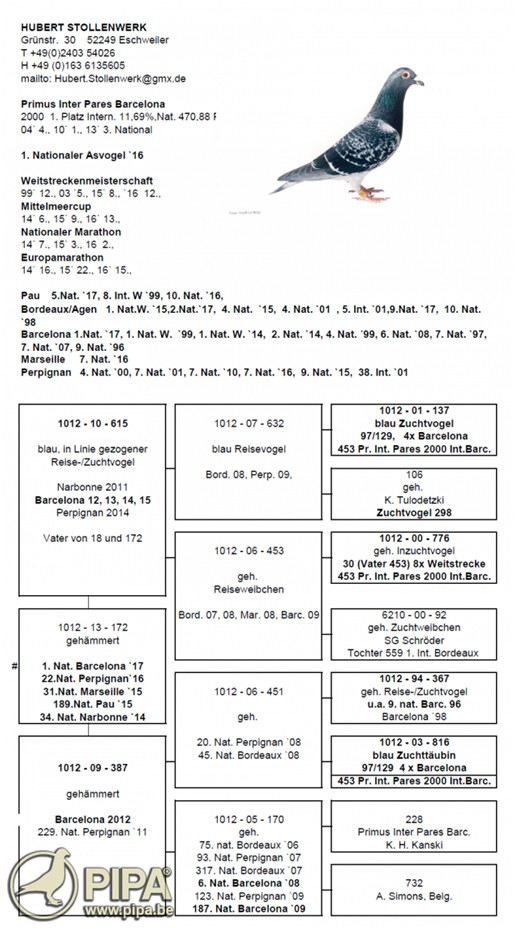 獲得巴塞隆納德國全國1.202羽冠軍為斯托倫維克休伯特(Hubert Stollenwerk)鴿舍,該舍冠軍鴿DV1012-13-172班母,是在比利時時間星期六下午14時23分○○秒歸巢,翔距1094.34公里,創下平均分速790.14米/分。