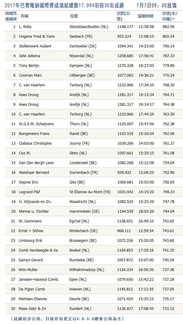 2017年巴賽隆納國際賽17.094羽總冠軍為荷蘭洛克斯萊昂(ROKS Leon)鴿舍
