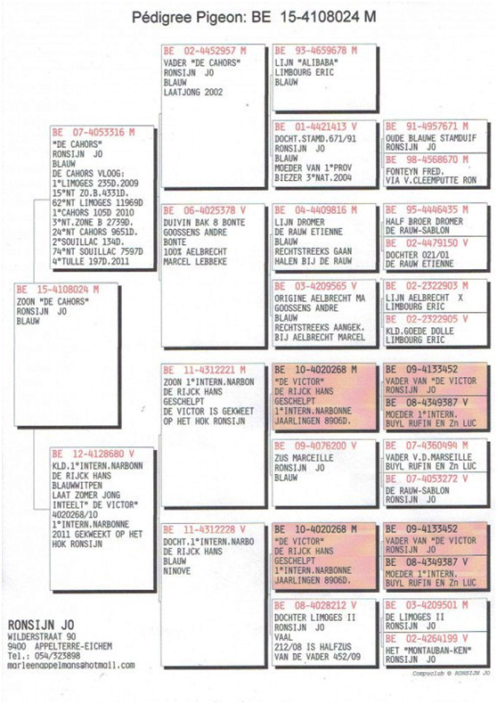 獲得比利時利蒙治II(Limoges II)全國成鴿組9.073羽冠軍為羅西.喬(Ronsijn Jo)鴿舍,該舍冠軍鴿B15-4108024灰公,是在比利時時間星期六下午15時50分0秒歸巢,翔距621.787公里,創下平均分速1173.18米/分。
