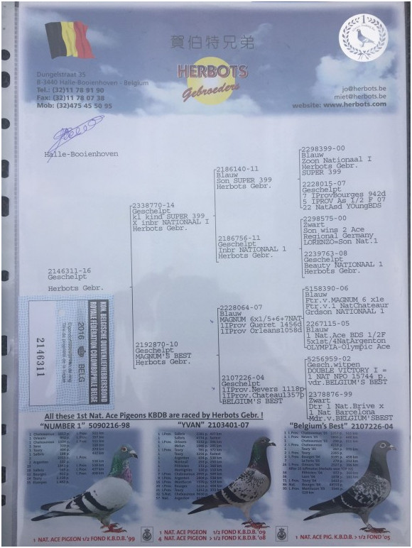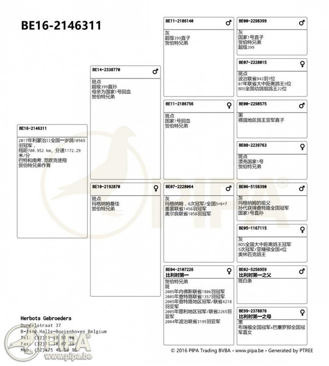利蒙治II比利時全國一歲鴿組10.565羽冠軍B16-2146311班母 中文翻譯血統書