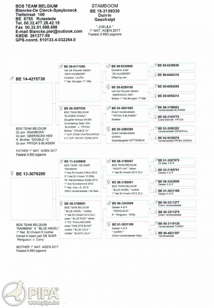 阿讓國際賽雌鴿組冠軍為BDS/布拉克(BDS/Blancke)鴿舍:冠軍鴿B15-3109330班母 血統書