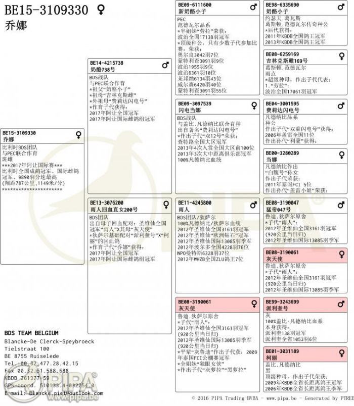 阿讓國際賽雌鴿組冠軍為BDS/布拉克(BDS/Blancke)鴿舍:冠軍鴿B15-3109330班母 中文血統書
