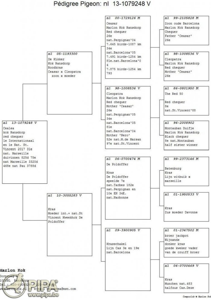 獲得聖維仙國際賽11.536羽總冠軍為荷蘭科克.馬龍(Kok Marlon)鴿舍,該舍冠軍鴿NL13-1079248紅母是在比利時時間星期日(隔日)早上5時1分37秒歸巢,翔距1075.29公里,創下平均分速1168.79米/分。