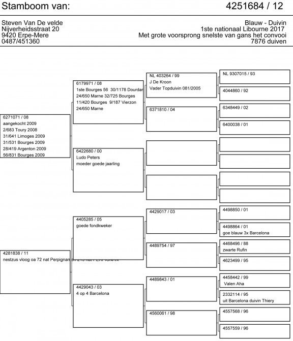 獲得2017年萊邦納比利時成鴿組3.928羽全國冠軍為範德維德.史帝文(Van De Velde Steven)鴿舍,該舍冠軍鴿B12-4251684灰母是在比利時時間星期六下午14時53分08秒歸巢,翔距741.896公里,創下平均分速1674.21米/分。同時也是萊邦納國家賽總數7.876羽總冠軍鴿。
