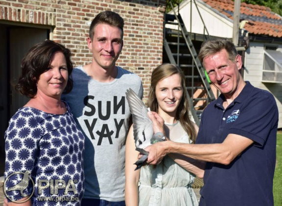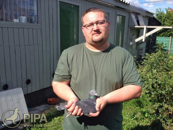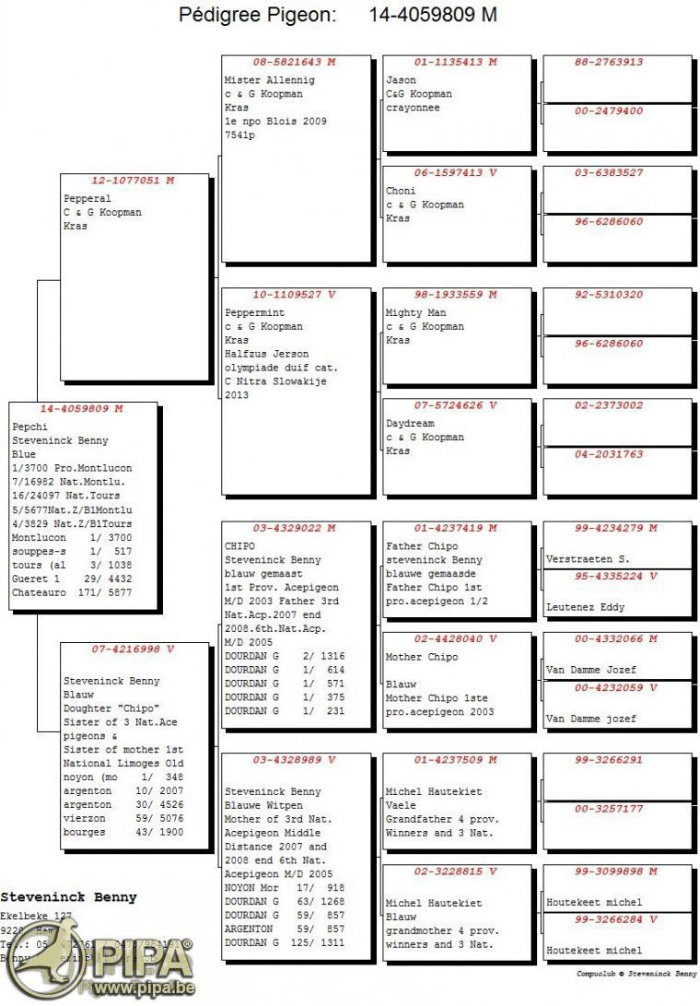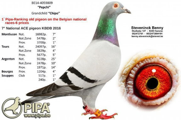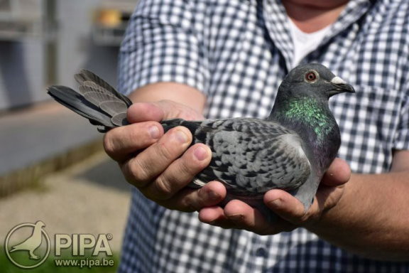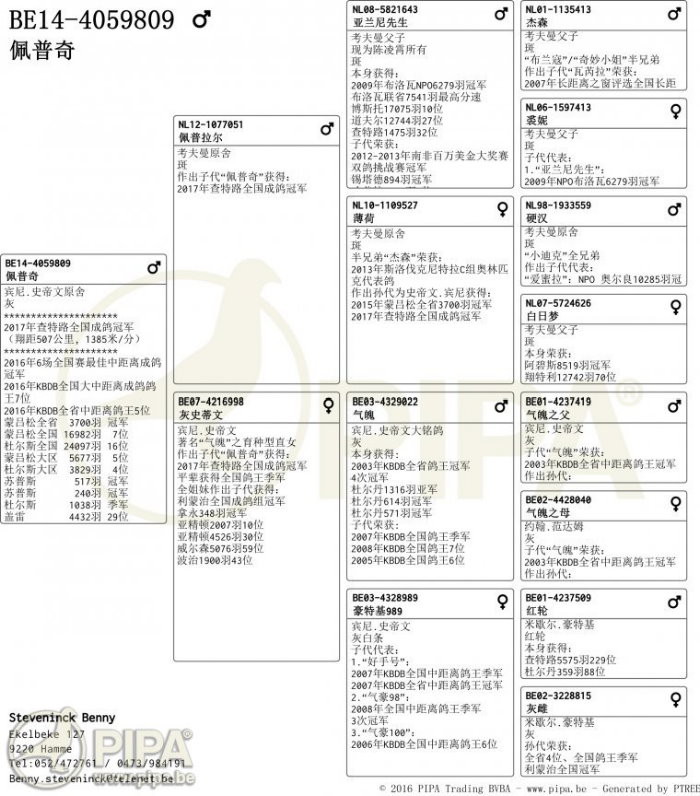查特路III比利時全國成鴿組2.782羽冠軍史帝文 賓尼(Steveninck Benny)鴿舍,該舍冠軍鴿B14-4059809灰公是在比利時時間8月14日(星期一)中午13時35分52秒歸巢,翔距506.81公里