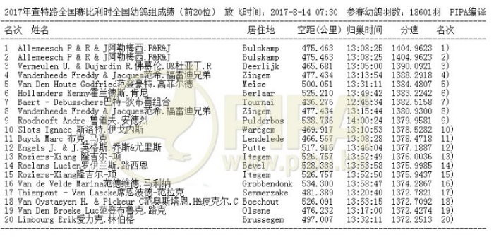 2017年查特路III全國賽幼鴿組18.601羽榜單(前20位):