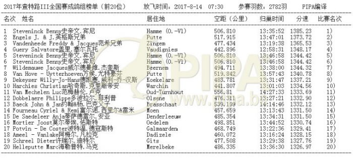 2017年查特路III全國賽成鴿組2.782羽榜單(前20位):