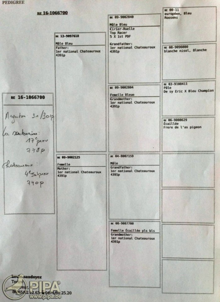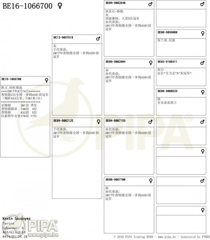 查特路III比利時全國一歲鴿組4.391羽冠軍為紹杜耶茲 凱文(Saudoyez Kevin)鴿舍,該舍冠軍鴿B16-1066700班母,是在比利時時間8月14日(星期一)中午12時43分52秒歸巢,翔距433.673公里,創下平均分速1381.71米/分。