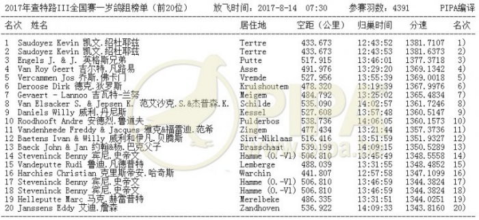 2017年查特路III全國賽一歲鴿組4.391羽榜單(前20位):