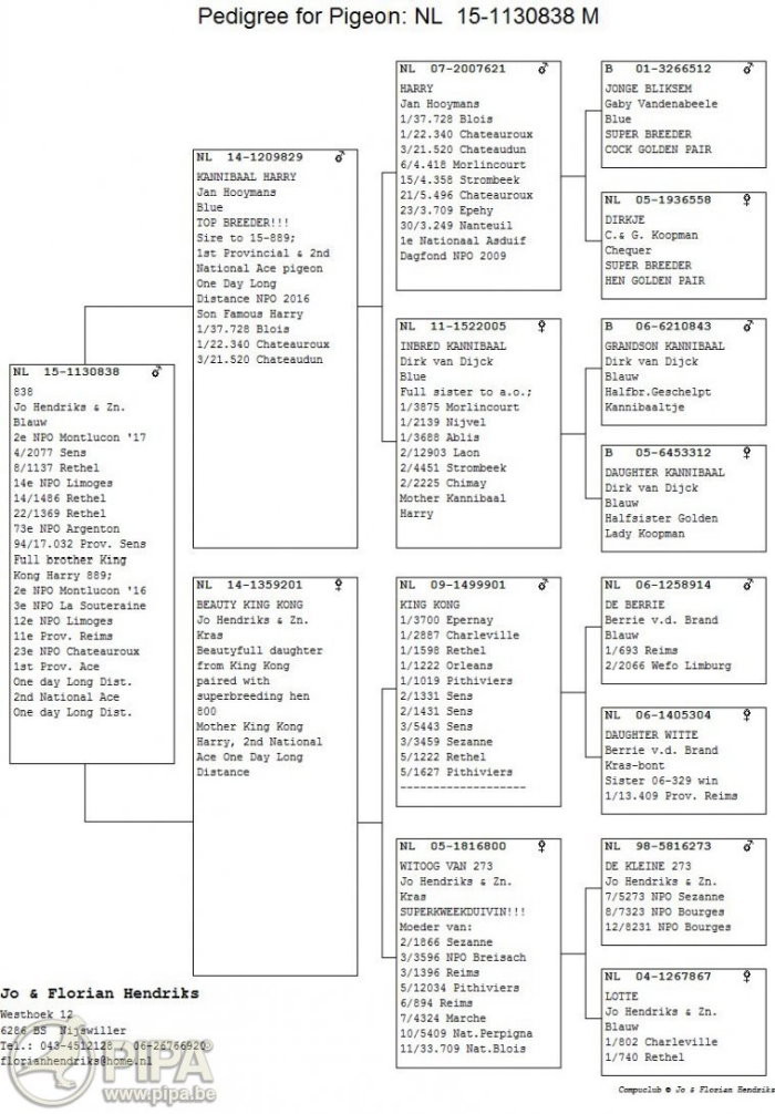 范王路易鴿舍在亞精頓賽的表現非常出色,他們的首羽歸巢鴿NL15-3541307獲得NPO亞精頓3095羽季軍。他的父親出自"哈利兄弟",這是出售的唯一"哈利"的兄弟。"哈利兄弟"已經作育子代獲得NPO拉索特年亞軍、NPO魯飛季軍、NPO吉恩6位和NPO南圖10位,查看NL15-3541307的血統書。
