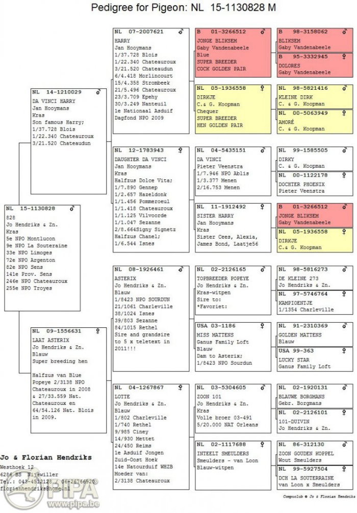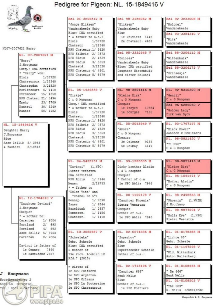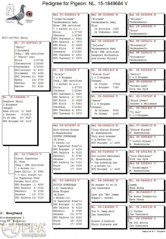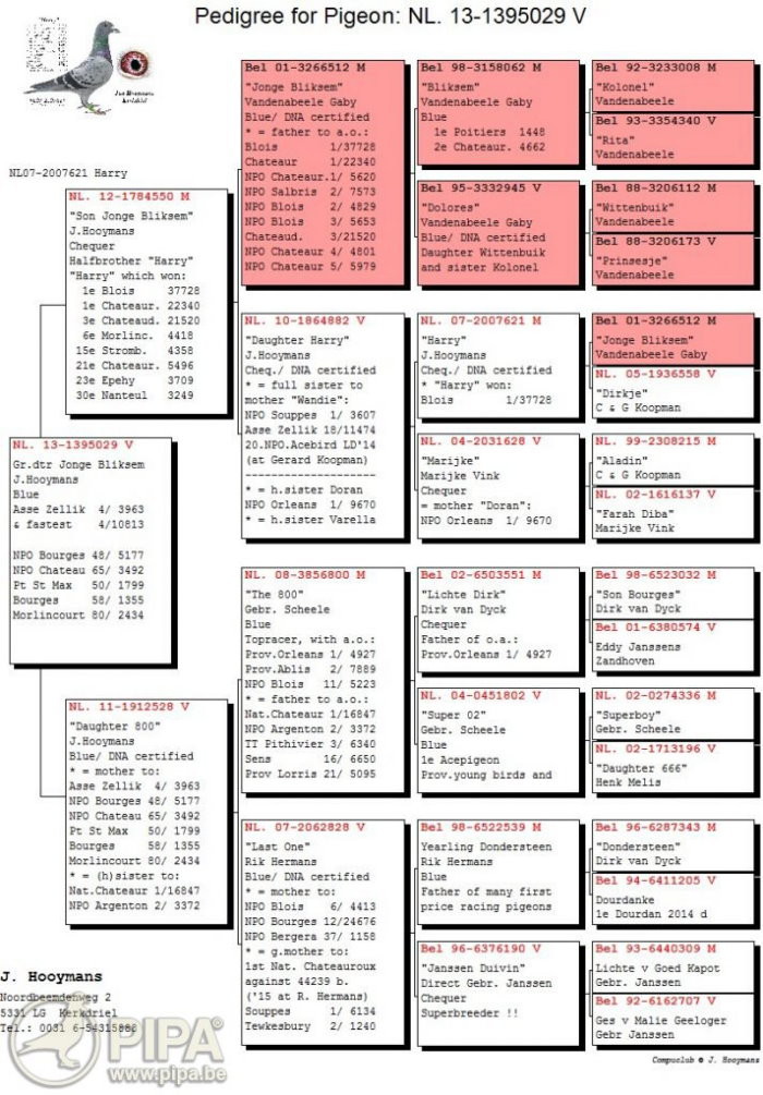上周她獲得貝吉拉克全國冠軍,她的獲獎鴿為NL14-3430896 "柯爾"(Cor)。從"柯爾"的血統書,可以看到他的父母雙方的血統都和胡曼斯的鎮舍種鴿配對:"年輕閃電號"x"迪克雌"密切相關。這羽天賦賽將是"哈利"的孫代 ,他的母親是"未來男孩"(Future Boy)之孫代,而"未來男孩"是"哈利"的全兄弟。. 點擊此處查看 貝吉拉克全國 8,389羽冠軍鴿之完整血統書.