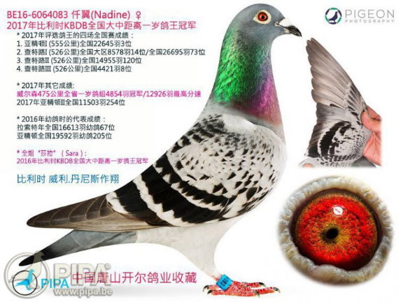 "仟翼" (Nadine),原名"賽琳"(Selin),2017年比利時KBDB全國大中距離一歲鴿王冠軍