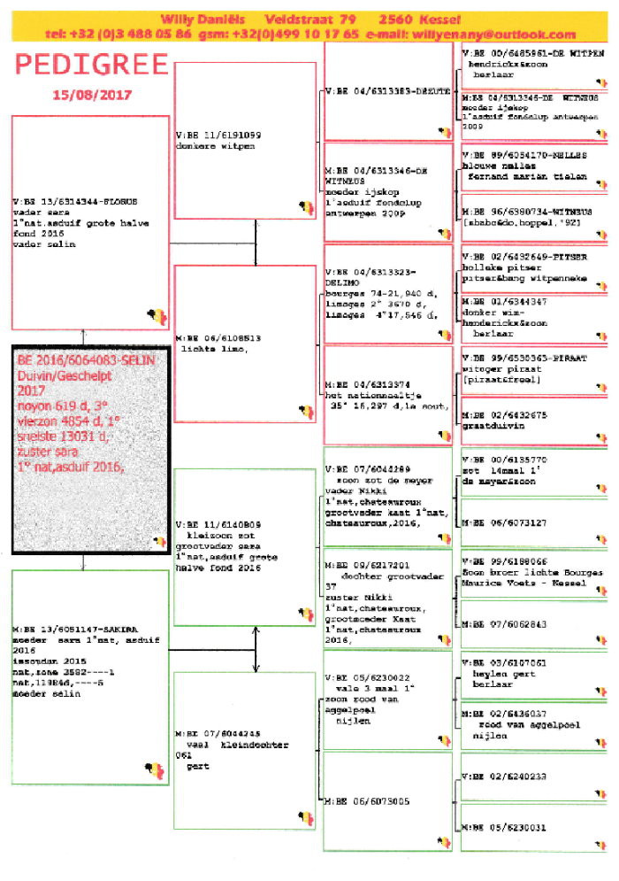 開爾鴿業邢總從未停下腳步引進世界最優秀和最獨一無二的超級鴿。此前他重要的引進包括比利時克裡斯.赫伯瑞(Chris Hebberect)的全國鴿王冠軍"愛克"(Ike)、比利時狄傑克戰隊(Team De Jaeger)的全國鴿王冠軍"勇士號"(Warrior)和福瑞克-阿倫的鴿王"諾瑪"(Norma),以及無數的蓋比原舍鴿珍貴收藏…等等。邢總對威利.鄧尼斯的這羽雌鴿傾心已久,特別是她在8月14日鴿王爭霸戰最後一場全國賽事查特路全國賽再次取得頂級成績,成功奪得了2017年比利時KBDB全國大中距離一歲鴿王冠軍寶座。 而且邢總得知這只鴿王冠軍雌鴿鴿王幼鴿時期表現已非常出色,他對這羽超級雌鴿的興趣更加濃厚。另外,她的全姐"莎拉"(Sara)也在2016年奪得比利時KBDB全國大中距離一歲鴿王冠軍,這絕對是一項獨一無二的成就,此前從來沒有同父母的2羽賽雌連續兩年獲得全國鴿王冠軍頭銜的先例。不必多說,邢總立馬買了機票, 親赴比利時,勢必要將這羽鴿王冠軍雌鴿納入自己豪華的種鴿陣容中。查看"賽琳"的血統書。