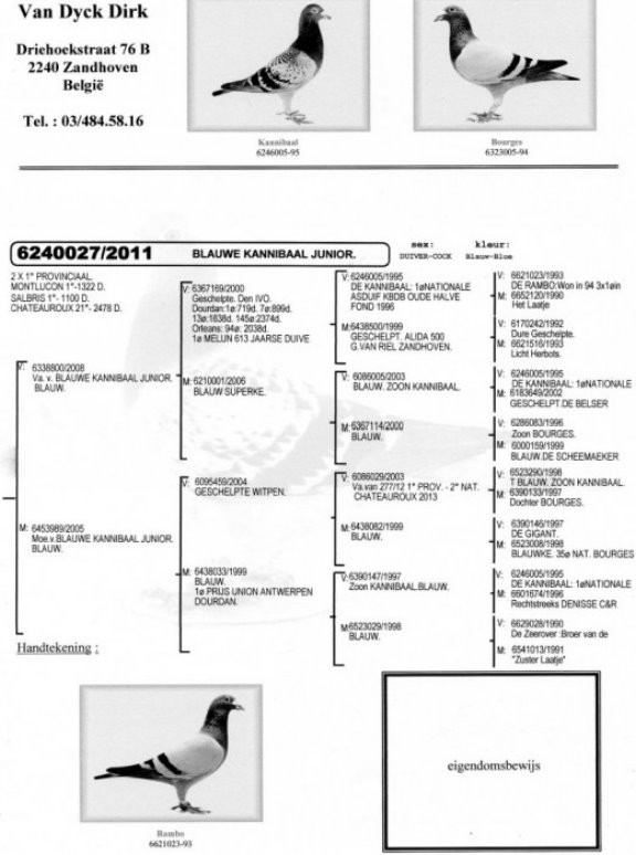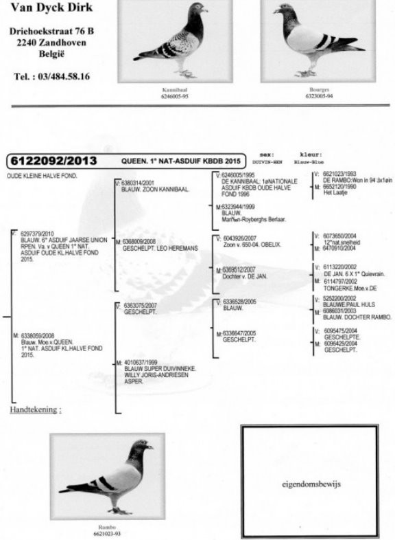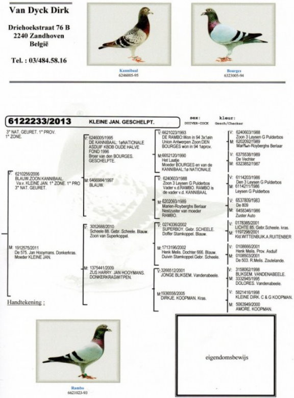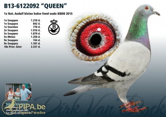 迪克.凡戴克在上世紀90年代湧現了黃金一代:眾多標誌性種鴿,例如"所向無敵"、"波治號"(De Bourges)和"藍波"(De Rambo)。他在過去10年內也同樣成功,迪克最大的優點是永遠不拒絕改變,他不懼怕新的挑戰。幾年前他聽從葛斯頓.范德瓦爾和巴特.吉林克斯的建議,他們兩位都以成功使翔雌鴿戰隊著稱。幾年後我們無法想像迪克的賽鴿已經成為一支雌鴿戰隊。