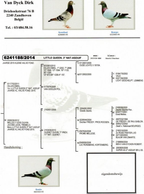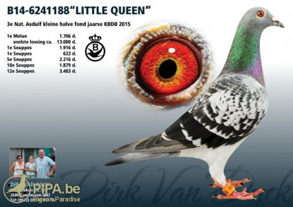 "小女王"的父親為艾米爾.狄倫(Emiel Dillen)原舍,母親為萊昂.雅克布原舍鴿,出自他的蓋雷全省1661羽冠軍(布拉邦聯盟)。