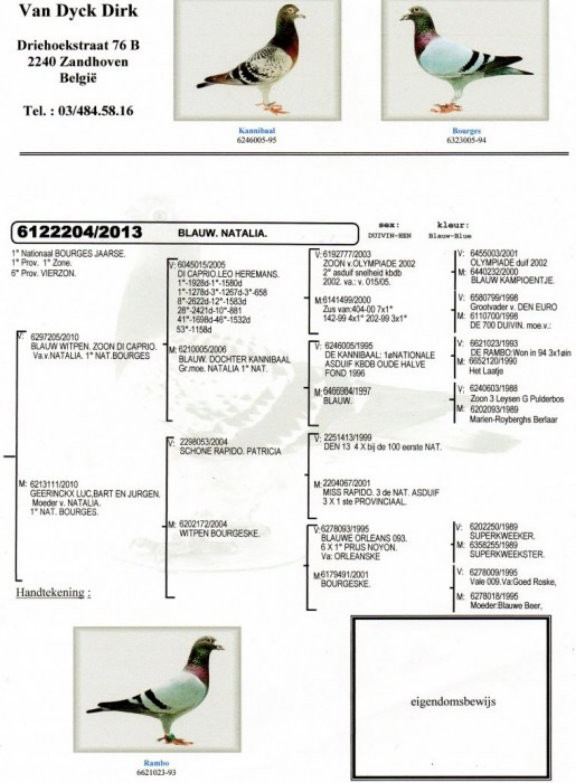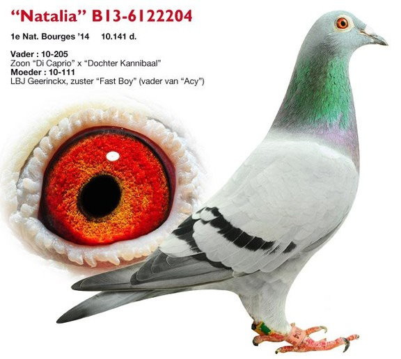 "娜塔莉亞"的父親為裡歐.賀爾曼的"迪卡普里奧"直子,"迪卡普里奧"是迪克非常滿意的引進。母親為巴特.吉林克斯原舍,她是"艾希"父親的全姐妹,"艾希"獲得2015年布達佩斯奧林匹克C類冠軍和2013年KBDB全國中長距離鴿王亞軍。