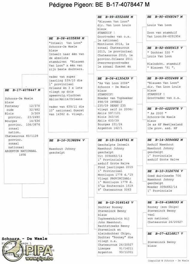 獲得比利時亞精頓 I全國(一歲鴿組)19.858羽冠軍為斯豪斯-德瓦勒(Schoors-De Waele)鴿舍,該舍冠軍鴿B17-4078447灰公,是在比利時時間6月23日(星期六)下午14時13分31秒歸巢,翔距533.859公里,創下平均分速1231.46米/分,同時也是此次亞精頓 I全國交鴿總數31.683羽的總冠軍鴿。